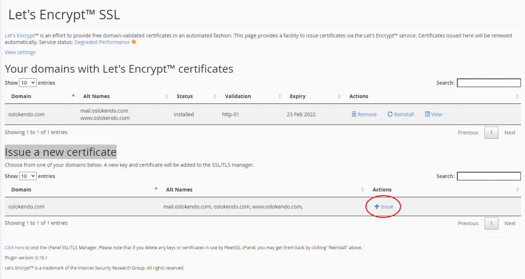 - Klikke på + Issue i avsnittet Issue a new certificate / Actions